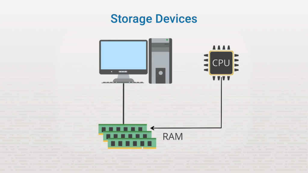 RAM can also be considered a hardware component called a storage device. A storage device is any hardware component that stores data, either temporarily or permanently. When data is stored temporarily, short-term storage such as RAM is used. It’s important to know that RAM is considered volatile memory, that means it’s not persistent. For example, if the computer is turned off or loses power, all the data that was stored in RAM is lost. It’s gone forever.